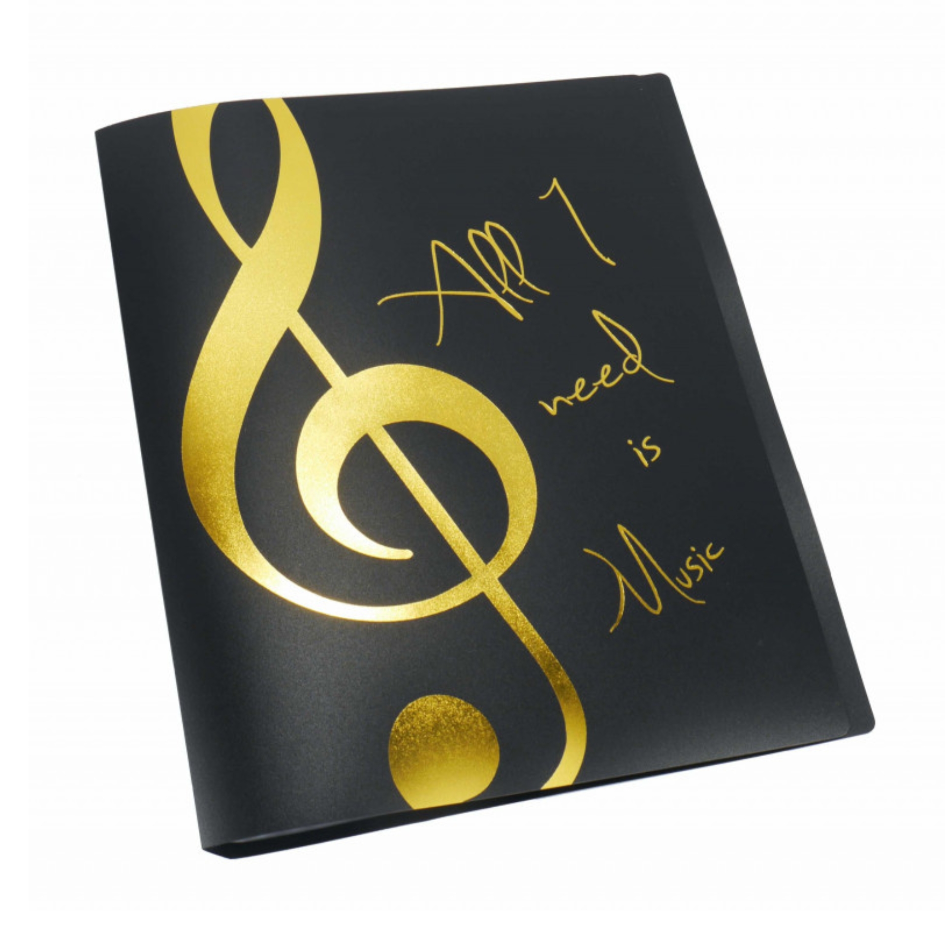 Stylish plastic folder in elegant black with shiny gold lettering ‘All I Need is Music’. Equipped with 20 transparent pockets (A4) - ideal for storing sheet music, documents or papers. Robust, lightweight and perfect for school, rehearsals or the office!