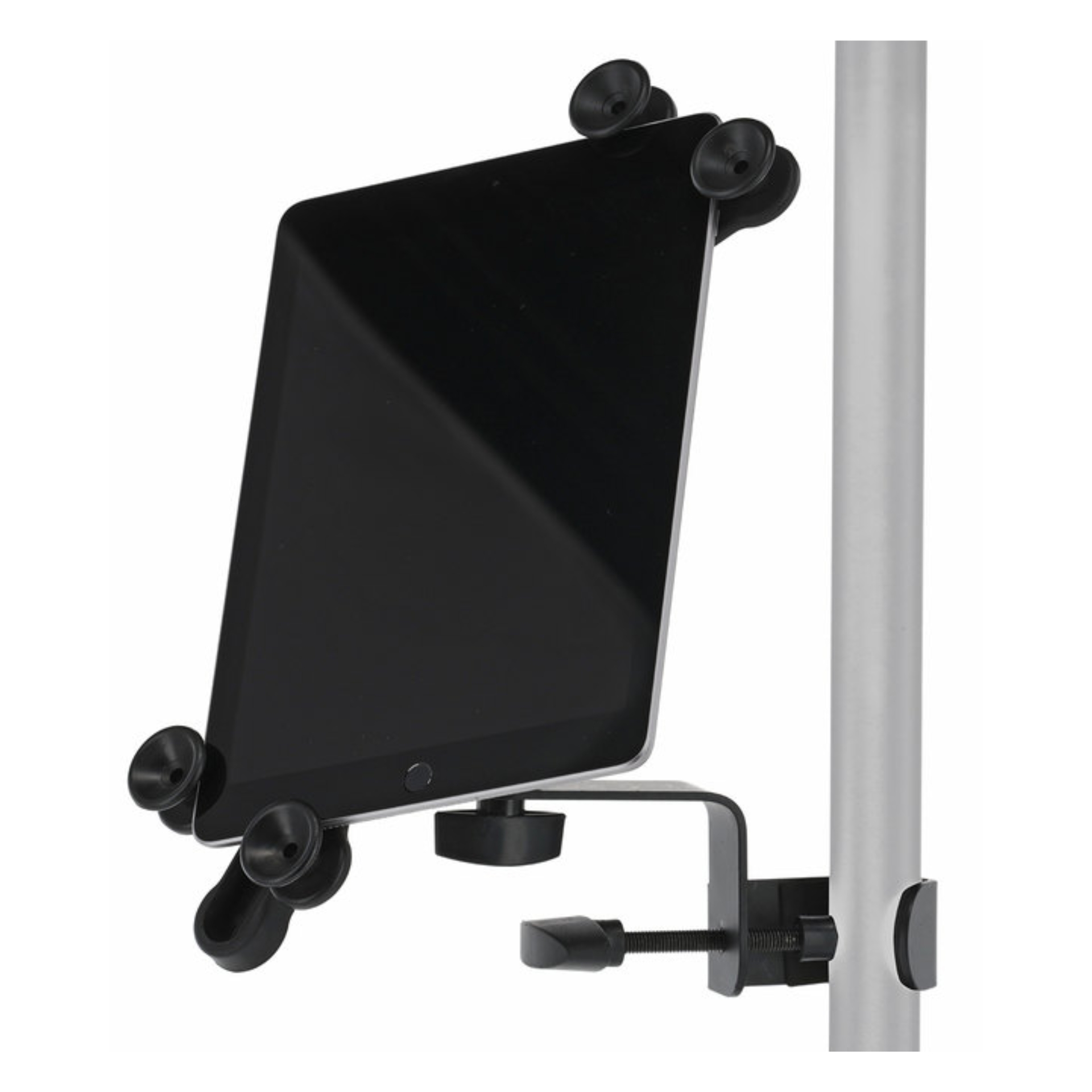 The Gewa Tablet Holder is compatible with nearly all tablet computers, including Apple, Android, and Windows devices. It can be mounted on (microphone) stands with a 5/8" thread or using the included clamp (10 - 25 mm) for tripod mounting. The holder is infinitely adjustable in rotation and tilt, allowing you to position your tablet perfectly. All device ports remain easily accessible. The holder is available in two different sizes.