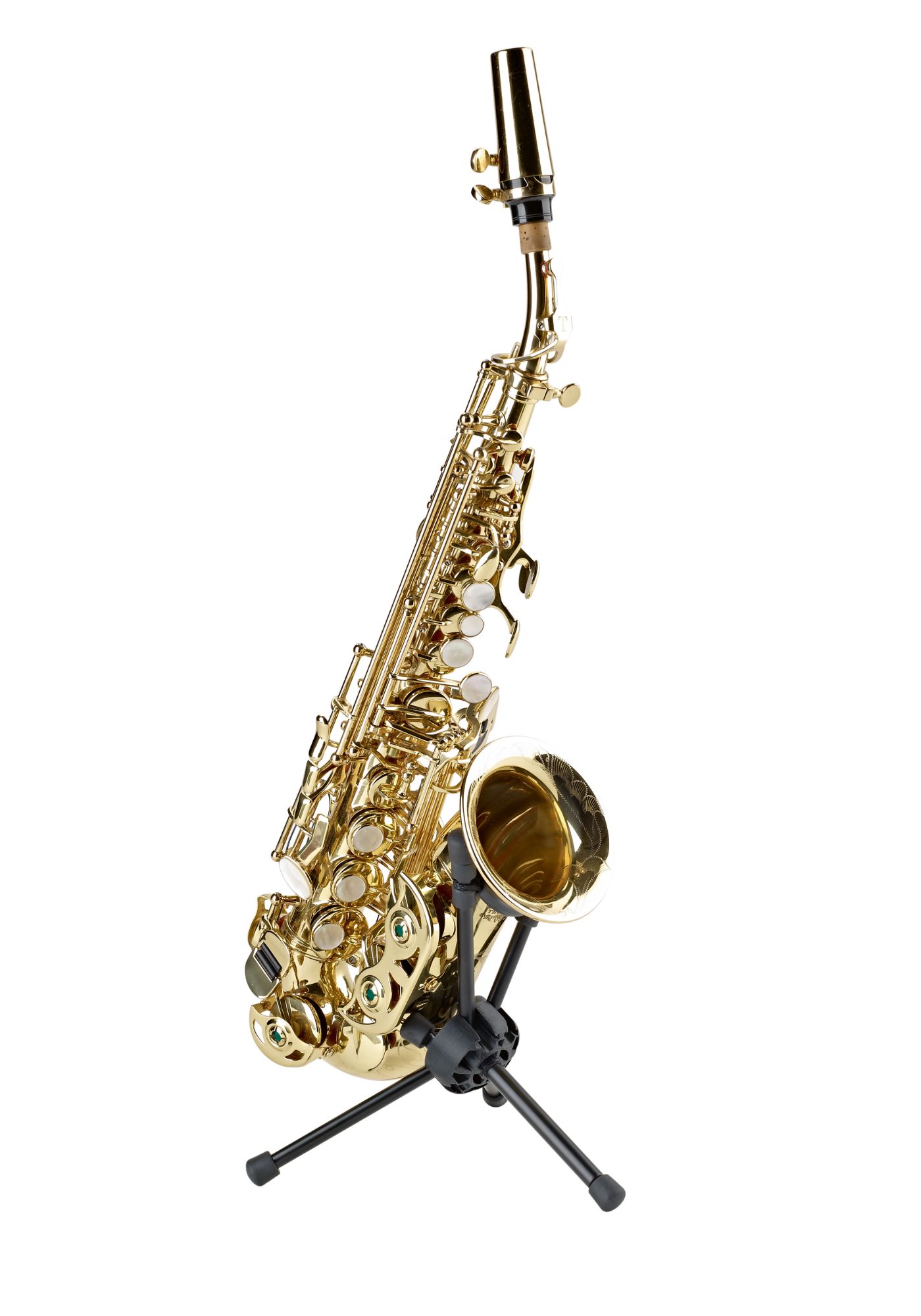 Sturdy and practical: The ultra-compact Saxxy saxophone stand supports curved soprano saxophones. The standout feature is that the folded stand can be stored and transported in the included velvet bag, which fits inside the saxophone’s bell.