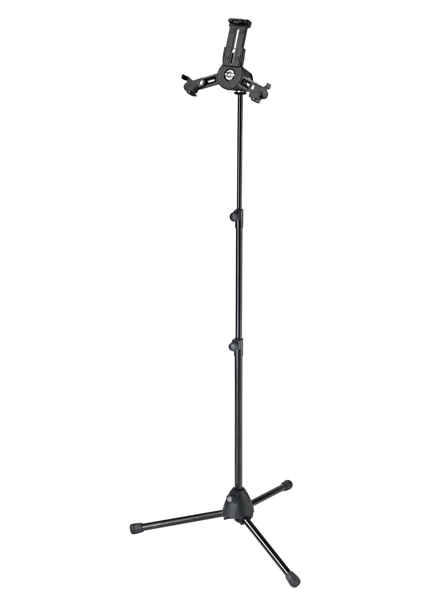 The combination of the stand and universal tablet holder supports you both on stage and at home or in the studio. The adjustable holding arms accommodate various tablet sizes and allow for easy attachment and removal of the tablet via a snap closure. The tablet s tilt can be adjusted infinitely with a wing nut to find the perfect position for each user. The tablet can be easily rotated between portrait and landscape mode, with mechanisms preventing unintended rotation. The lightweight stand is extendable in two stages and offers infinite height adjustment, making it easy to transport with its compact size.