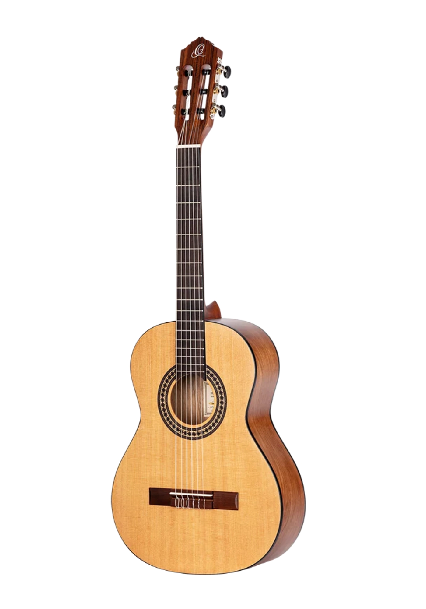 The Ortega Student Series 3/4 concert guitar is ideal for students, but its high-quality materials and careful craftsmanship also make it a compelling instrument for advanced players. The top is made of cedar with a matte satin finish and is complemented by a classic rosette and ABS binding. An Ortega 6-hole bridge ensures optimal string attachment. With a scale length of 590 mm, 18 frets and a nut width of 45 mm, it offers comfortable playability, especially for younger guitarists or players with smaller hands. The guitar is equipped with classic tuners, designed for right-handed players, and has a warm, natural sound with a matte finish.
