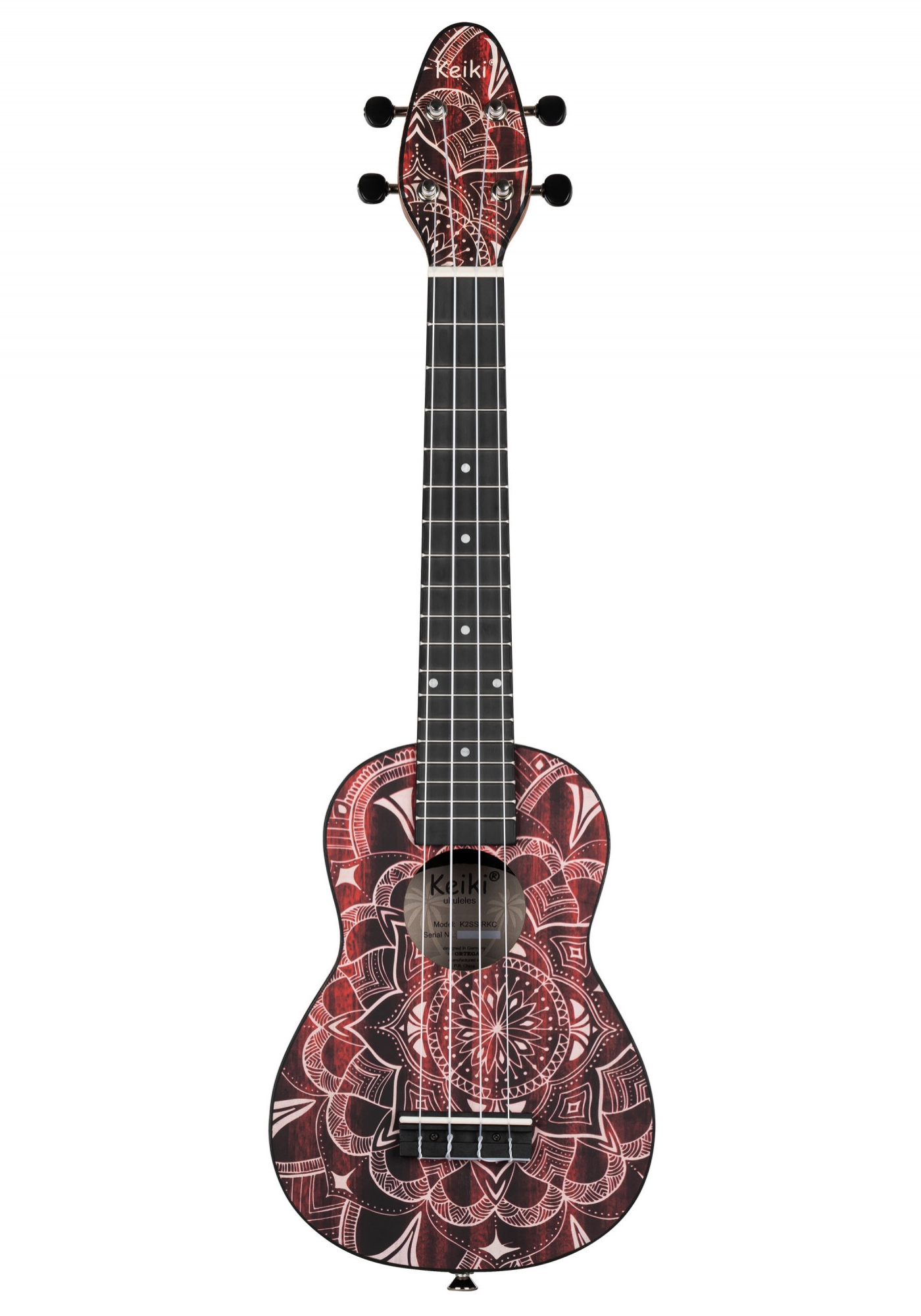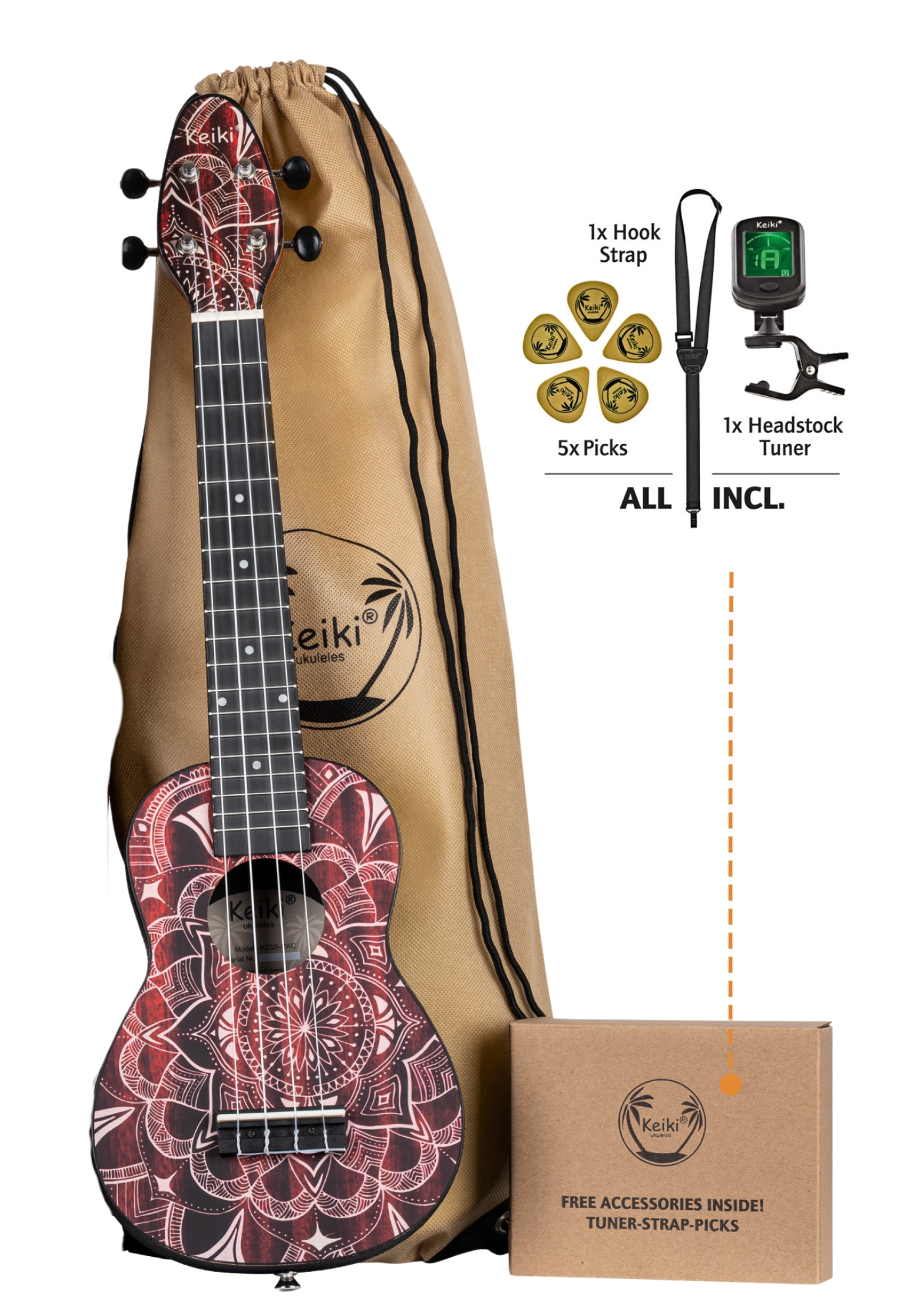 The Ortega KEIKI Soprano Ukulele - Red Kaleidoscope combines high-quality workmanship, first-class sound and extensive accessories. An ideal instrument for creative musicians who value sound, style and comfort.