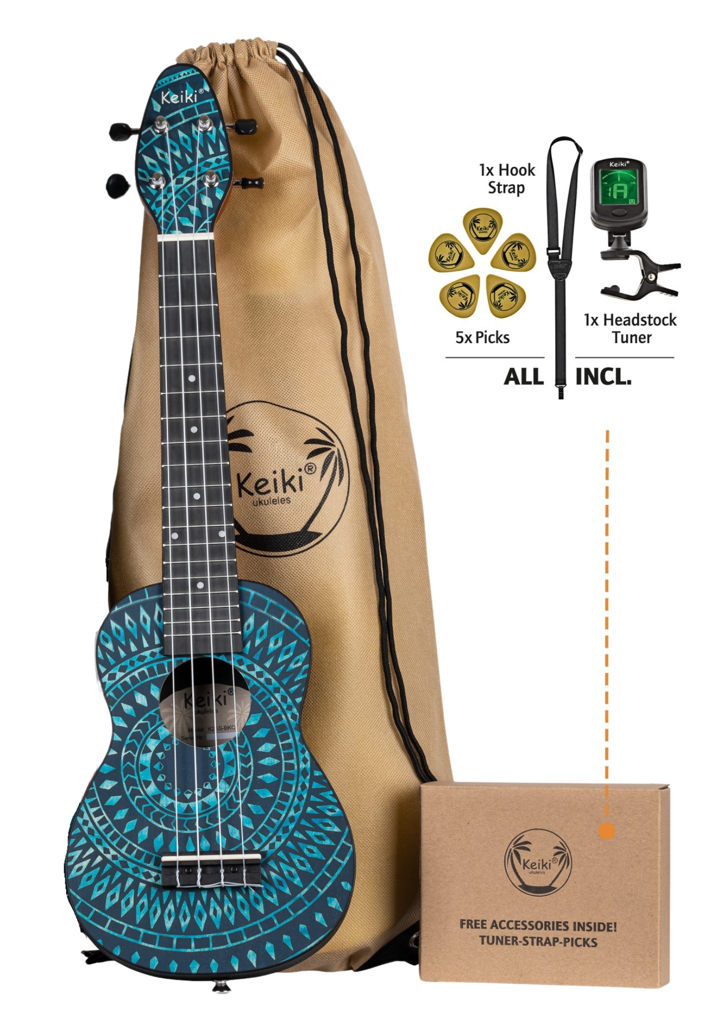 The Ortega KEIKI soprano ukulele is an ideal companion for travelling and, with its high-quality workmanship and pleasant sound, ensures playing enjoyment at all levels.Top Agathis Back & Sides ABS body, slightly arched Fingerboard ABS Neck Okoumé, matt lacquered Mechanics Open gear tuning machines chrome w/ black buttons Accessories Headstock tuner, Soundhole hook strap/support, 5 medium picks and drawstring bag included