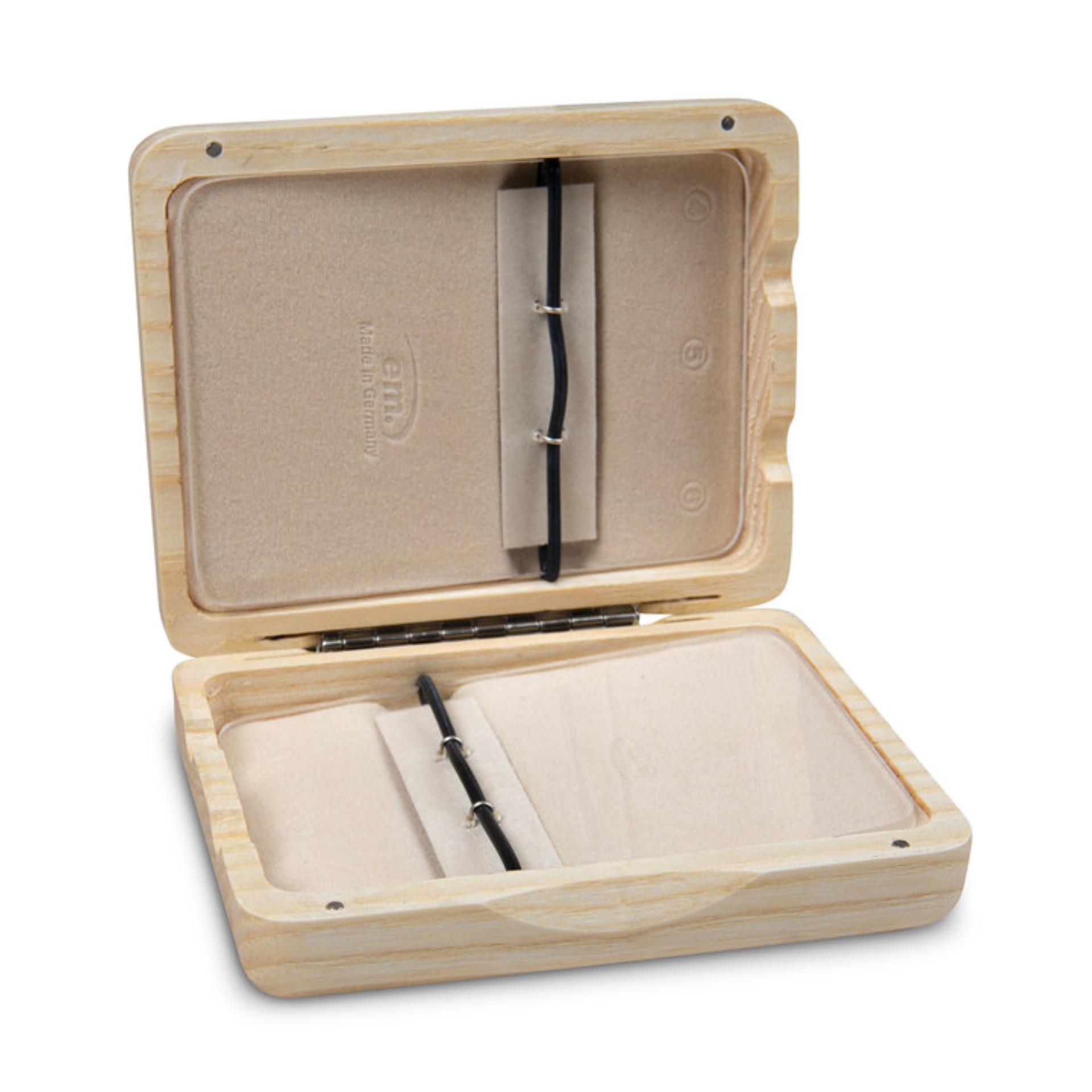 This natur lacquered solid wood reed case is designed for the safe and organised storage of up to six alto saxophone reeds with a length of up to 8 cm. The integrated glass plate allows for controlled storage of the reeds, while ventilation openings ensure even air exchange, contributing to the stability and longevity of the reeds. The sturdy solid wood case is equipped with a spring hinge that allows for easy opening and closing.