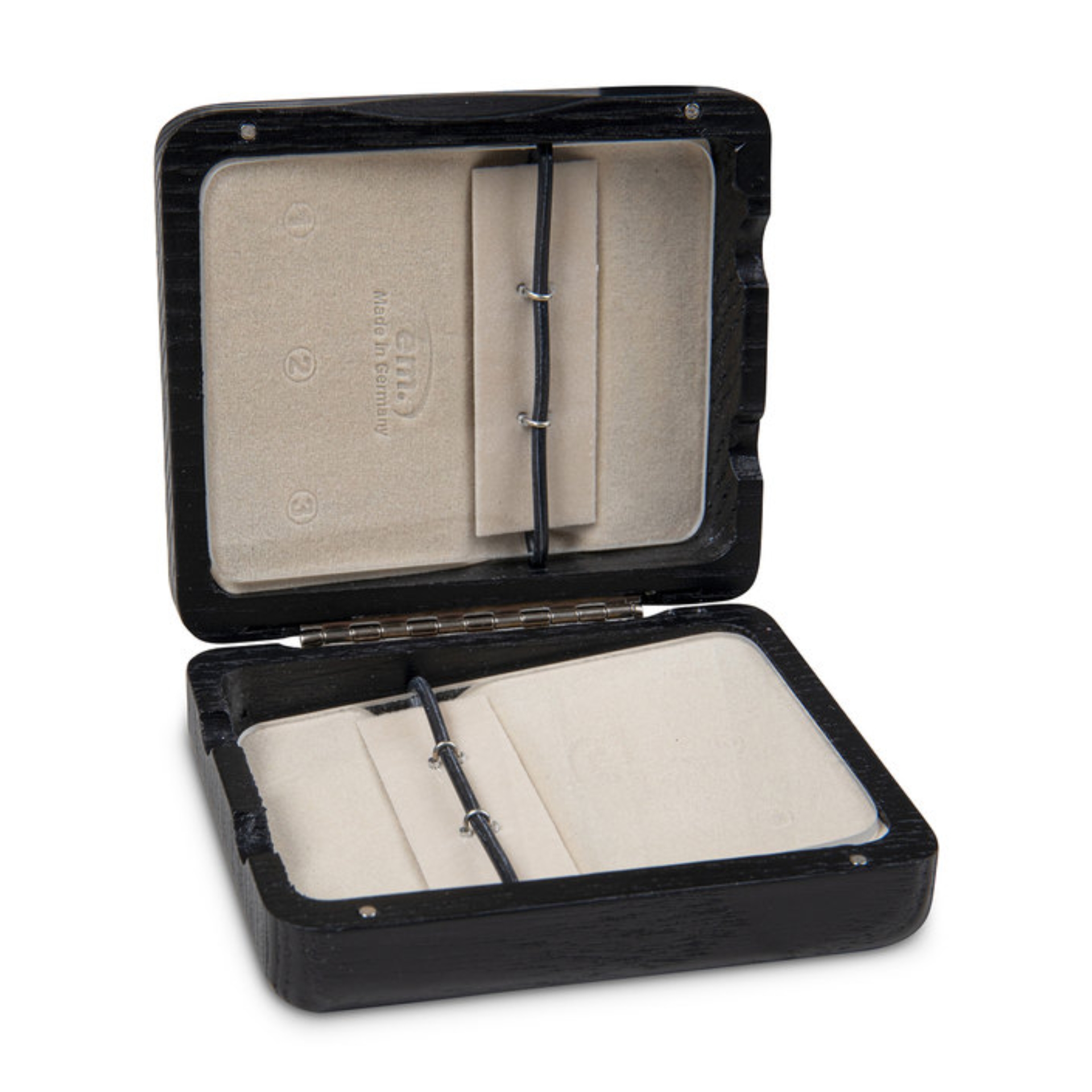 This black lacquered, velvet-lined solid wood reed case is designed for the safe and organised storage of up to six clarinet reeds with a length of up to 7 cm. The integrated glass plate allows for controlled storage of the reeds, while ventilation openings ensure even air exchange, contributing to the stability and longevity of the reeds. The sturdy solid wood case is equipped with a spring hinge that allows for comfortable opening and closing.