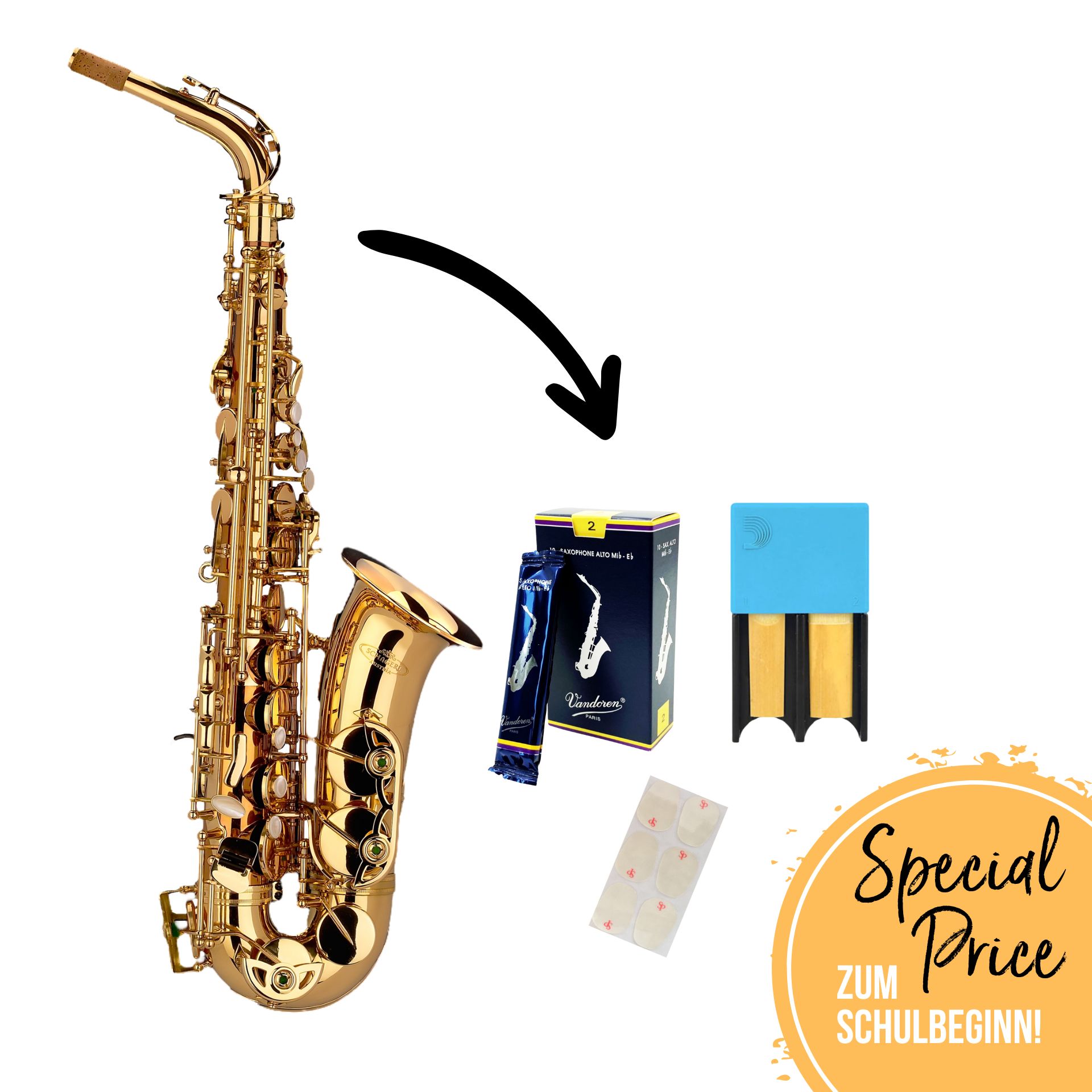 Important accessories include a mouthpiece, reed screw and capsule, saxophone reeds, a case, care and cleaning materials and a carrying strap.