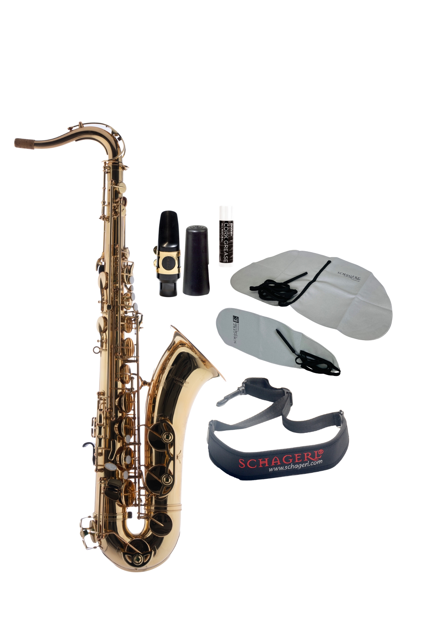 Important accessories include a mouthpiece, reed screw and capsule, saxophone reeds, a case, care and cleaning materials and a carrying strap.