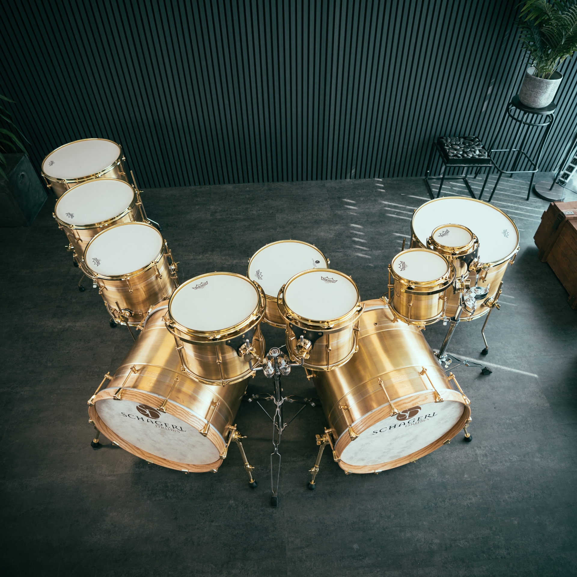 An extraordinary drum set for the highest tonal demands and maximum expressiveness: This 10-piece Schagerl drum kit in RAW/gold combines craftsmanship, innovation and impressive variety. The combination of patented brass shells and elegant gold hardware finish not only makes a visual statement, but also impresses with a unique sound spectrum that is unrivalled.