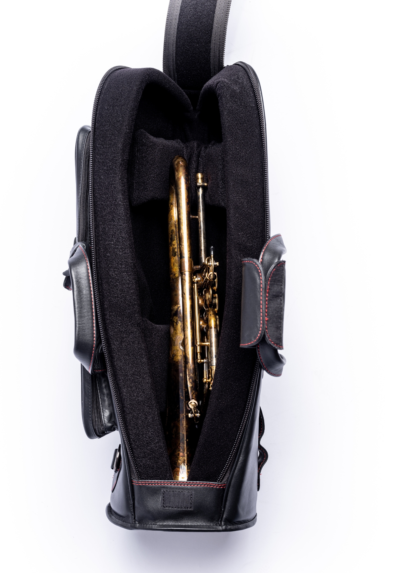 The elegant design is characterised by handles and accents made of high-quality black nappa cowhide, which not only looks classy but is also very robust. Two separate outer pockets offer plenty of storage space for accessories such as mouthpieces, sheet music or care products.