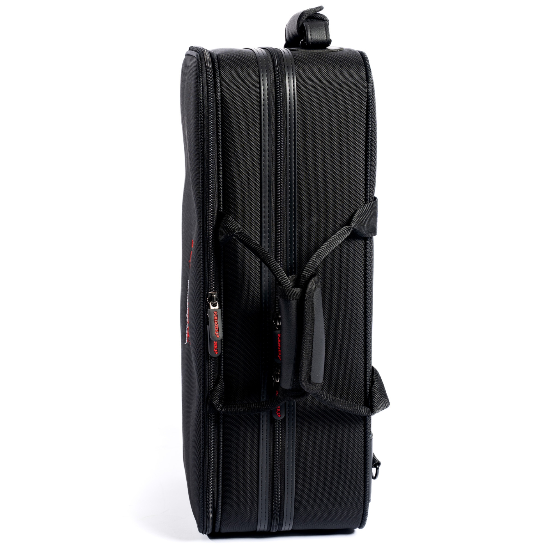 Das Case verfügt über einen seitlichen und oberen Haltegriff sowie zwei abnehmbare Rucksackriemen, die mit stabilen Metallkarabinern und lederverstärkten Halterungen ausgestattet sind. Diese Details garantieren höchsten Tragekomfort und eine lange Lebensdauer - ideal für den täglichen Gebrauch.
