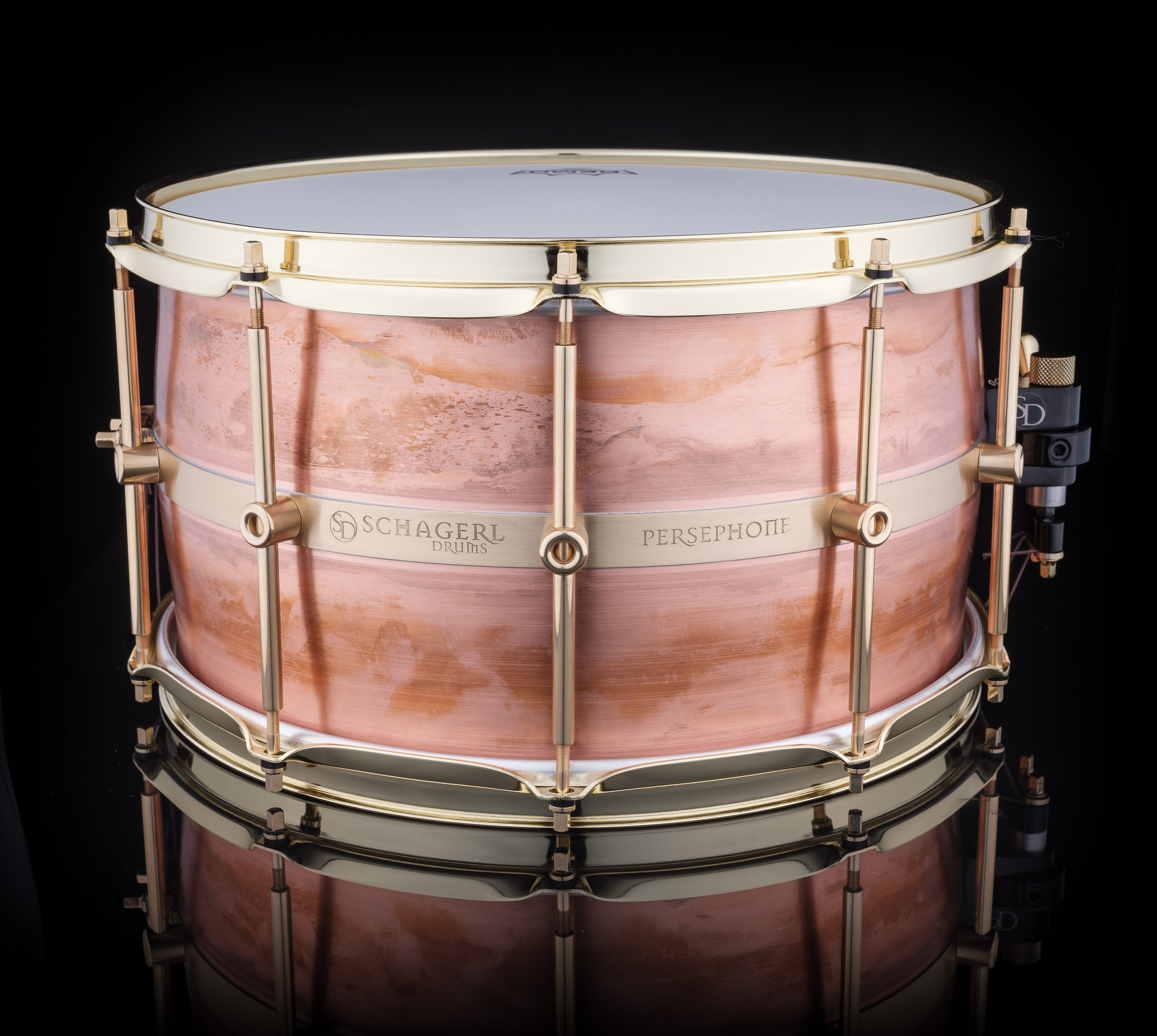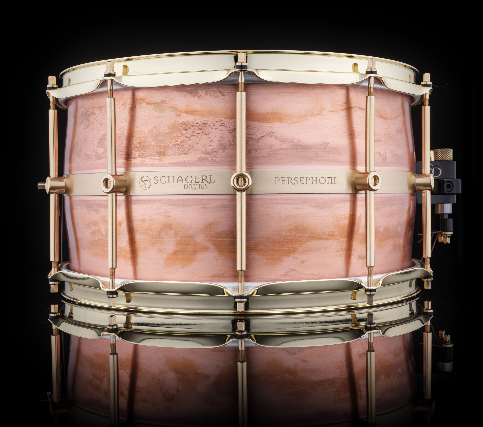 Persephone is every bit worthy of its Greek namesake. The dramatically undersized top and bottom edges create a cask shape which acts like a tympani drum, creating the purest of overtones, while remaining easily controllable. No two raw, raw lacquer or dark vintage drums are alike. The strainer is a Trick Drums Multistep strainer for precise snare control and the single point solid brass lugs allow the shell to resonate freely. The acoustically neutral nature of the copper shell makes it an ideal studio drum.