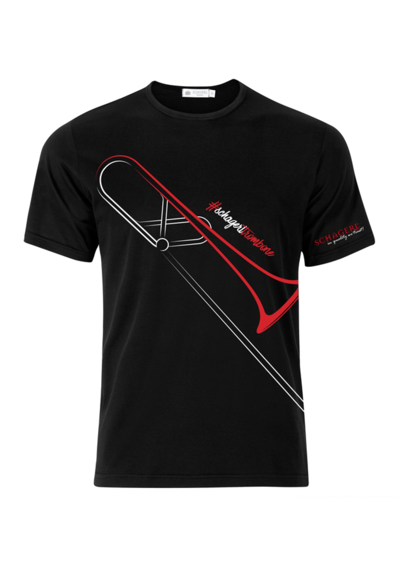 This beautifully shaped black T-shirt impresses with its comfortable fit and modern design. Made from 100% high-quality cotton in soft jersey fabric, it feels particularly comfortable against the skin. The front features a stylised Schagerl Kissbone trombone in red and white, making the T-shirt a real eye-catcher. The fit is slim and long, giving the shirt a figure-hugging fit and a modern length. Made under fair working conditions, this T-shirt combines quality, sustainability and style. It is washable at 30 °C and can be easily ironed, making it particularly easy to care for and durable. Ideal for anyone who wants to skilfully combine a passion for music with a fashionable appearance.