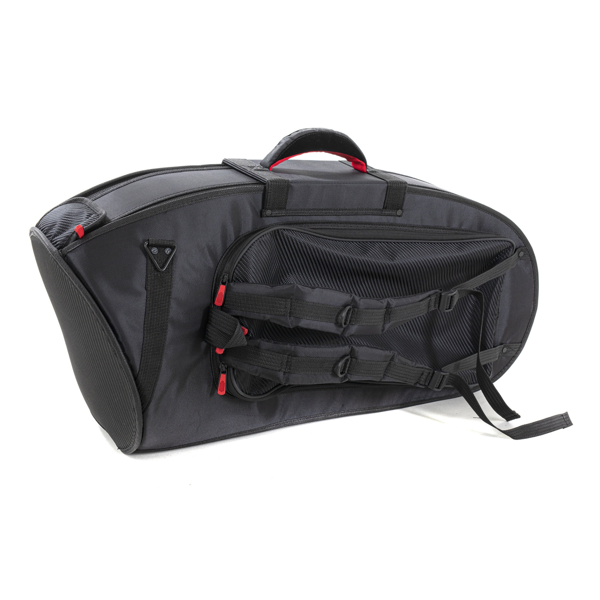 Verstellbare, versenkbare Rucksackgurte mit GEWA-Schnellverschluss und ein zusätzlicher Schultergurt bieten flexible Tragemöglichkeiten. Eine gepolsterte Sperrholzeinlage schützt den Schallbecher. Die ovale Bauweise sorgt für eine optimale Passform, während die aufgenähte Zubehörtasche und die Gurttasche, die auch als Notentasche dient, zusätzlichen Stauraum bieten.