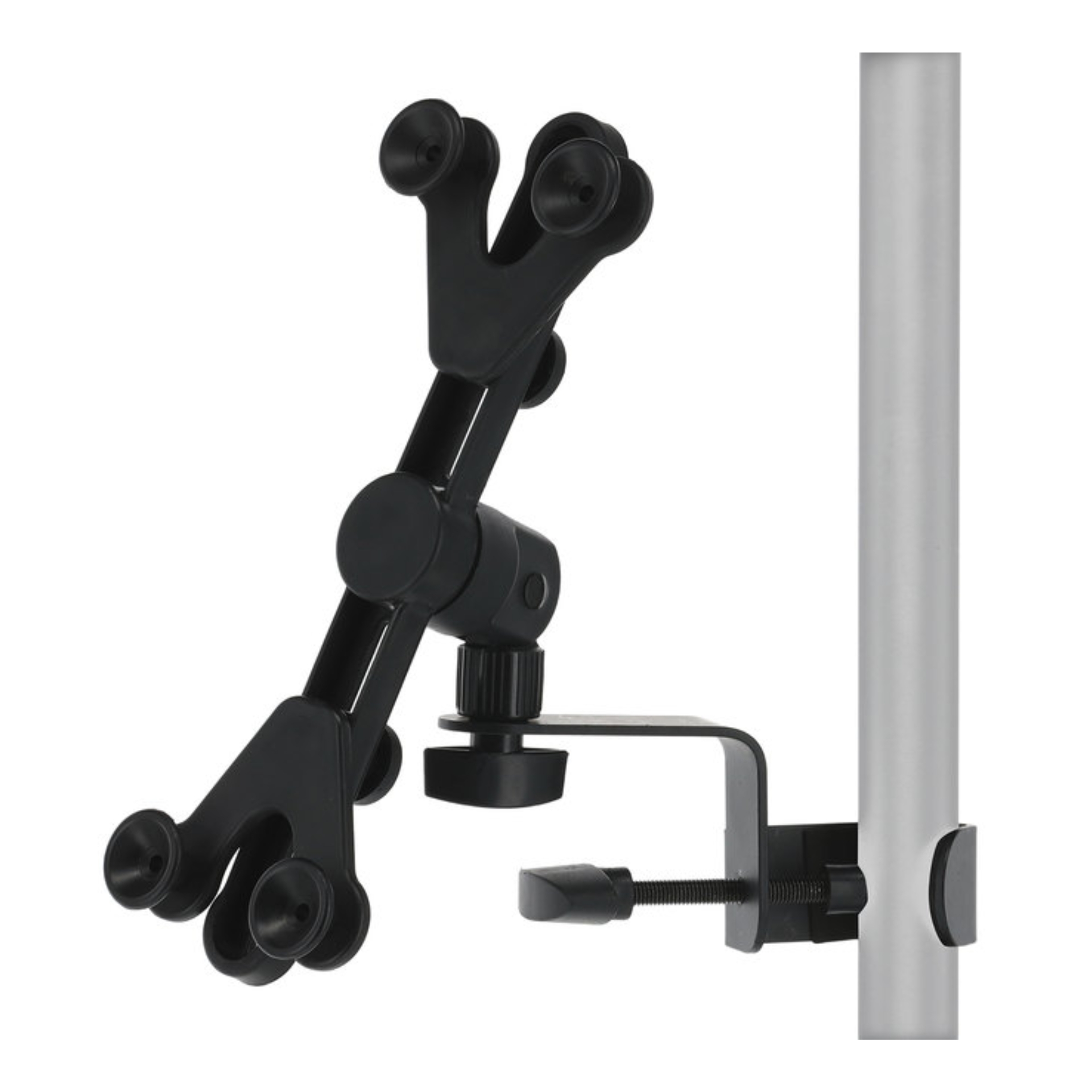 Die Gewa Tablet-Halterung ist passend für nahezu alle Tablet-Computer, einschließlich Apple, Android und Windows. Sie kann entweder auf (Mikrofon-)Ständern mit 5/8" Gewinde oder mittels der beiliegenden Rohrklemme (10 - 25 mm) an Stativen montiert werden. Die Halterung ist stufenlos dreh- und neigbar, sodass Sie Ihr Tablet immer optimal positionieren können. Alle Anschlüsse am Gerät bleiben dabei frei zugänglich. Die Halterung ist in zwei verschiedenen Größen erhältlich.