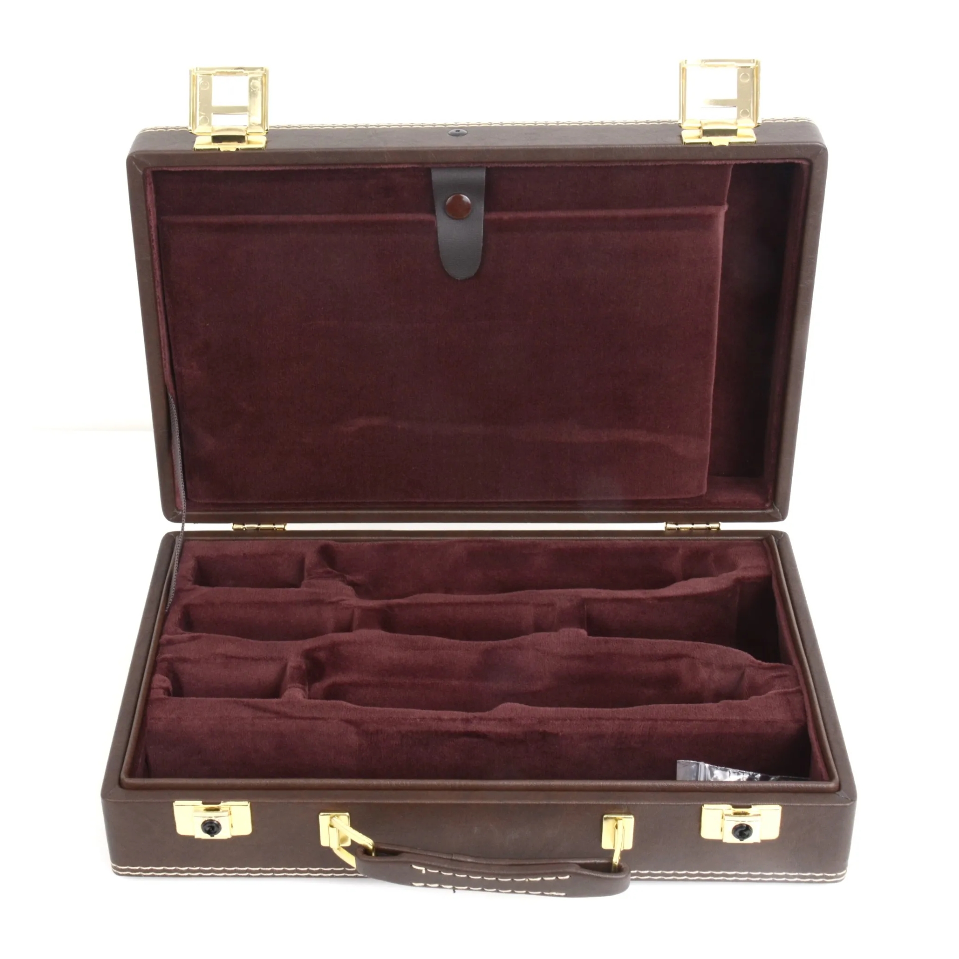 Das Hammerschmidt B-Klarinettenetui De Luxe 117d ist speziell für deutsche B-Klarinetten konzipiert und bietet eine hochwertige, durchdachte Aufbewahrungs- und Transportlösung. Das sechsteilige Etui bietet Platz für die Klarinette sowie für zwei Birnen und zwei Mundstücke und eignet sich optimal für Klarinetten des deutschen Systems. Der Innenbereich ist mit weichem Plüschfutter ausgestattet, das die einzelnen Teile sicher fixiert und zuverlässig vor Kratzern und Beschädigungen schützt. Zusätzlich steht Stauraum für Wischer und weiteres Zubehör zur Verfügung, sodass alle wichtigen Utensilien übersichtlich untergebracht werden können. Außen ist das Etui mit braunem Kunstleder bezogen, das für eine klassische Optik und eine robuste Oberfläche sorgt. Ein Notenfach ermöglicht den praktischen Transport von Notenmaterial, während das Hammerschmidt Logo Branding die hochwertige Verarbeitung unterstreicht.