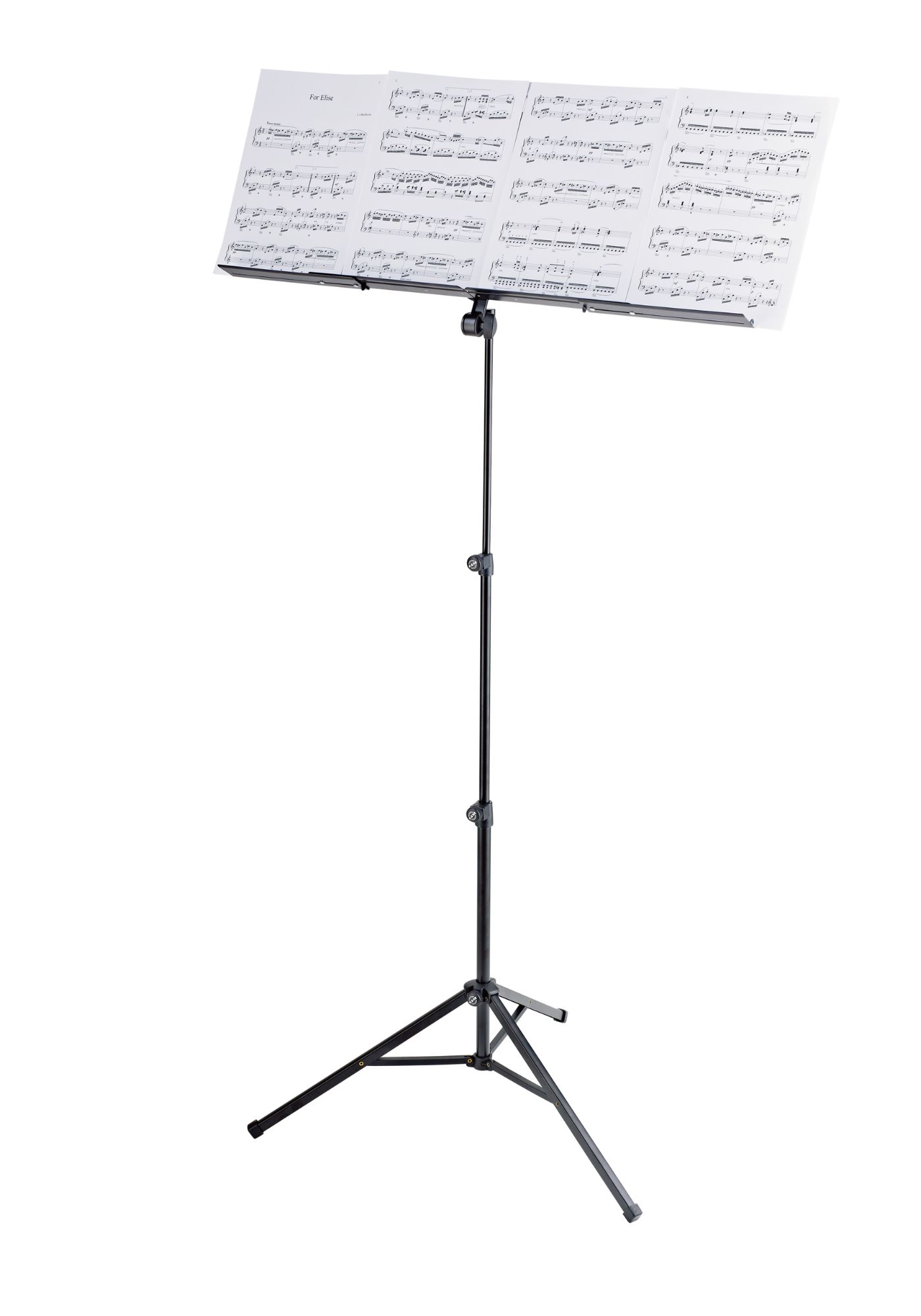 Das Notenpult verfügt über eine ausziehbare Notenauflage. Beide Notenauflagen können jeweils nach außen erweitert werden und ermöglichen zusammen mit den zusätzlichen Blatthaltern die sichere Ablage von vier DIN A4-Seiten nebeneinander. Die komfortable Schrägstellung erfolgt durch eine präzise Zahnrasterung aus Zink-Druckguss. Das zweifach ausziehbare Notenpult lässt sich zudem kompakt zusammenklappen.