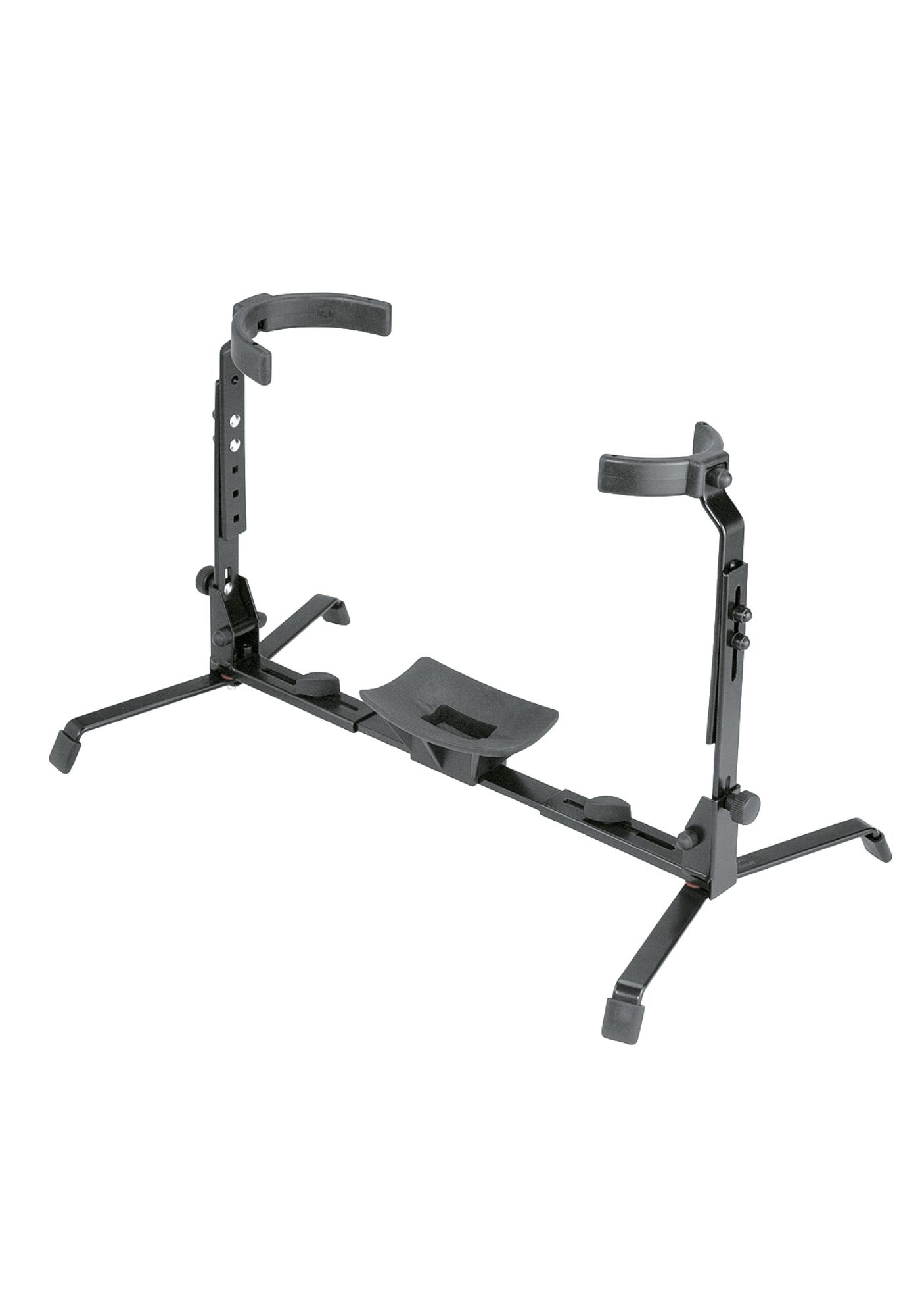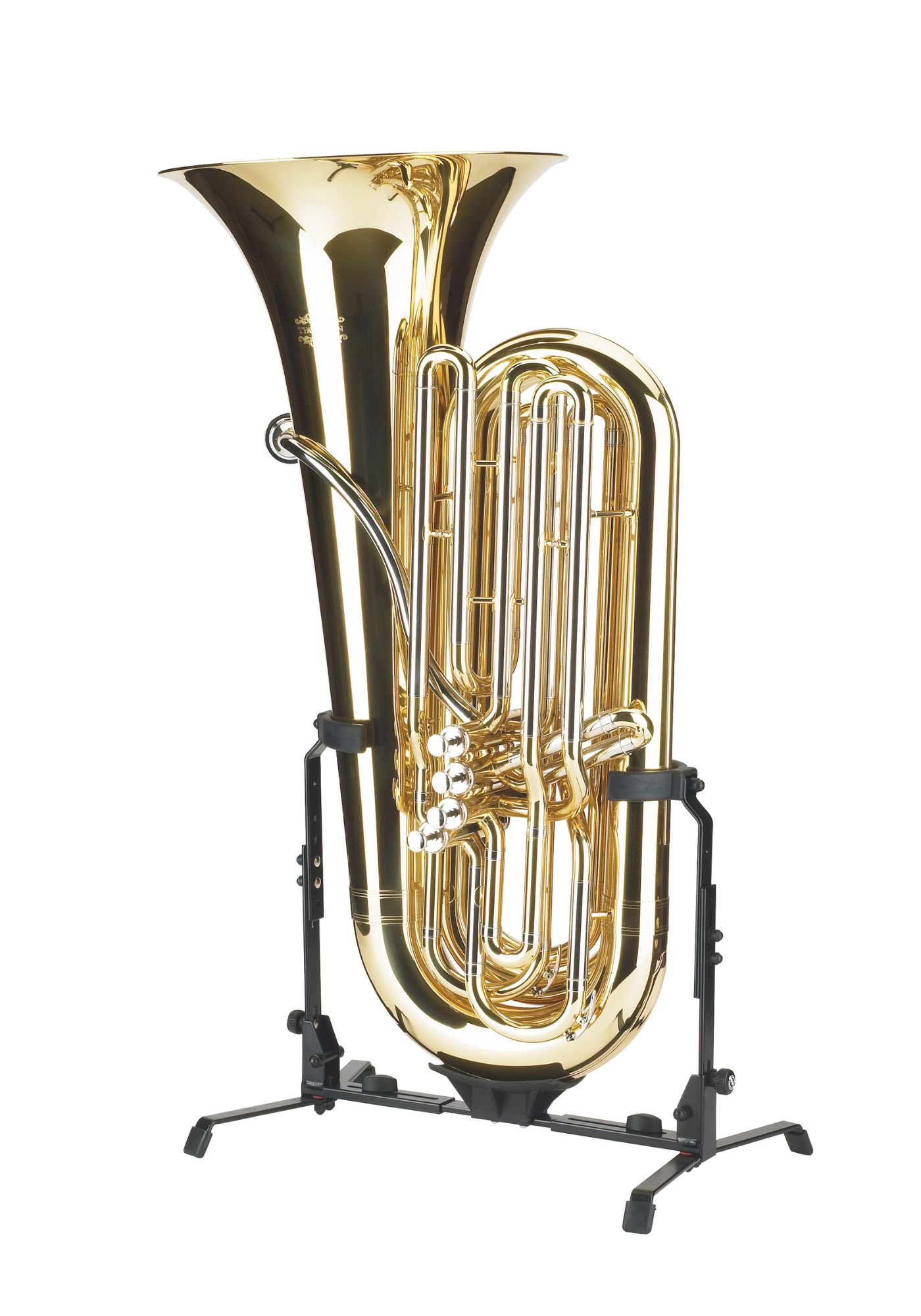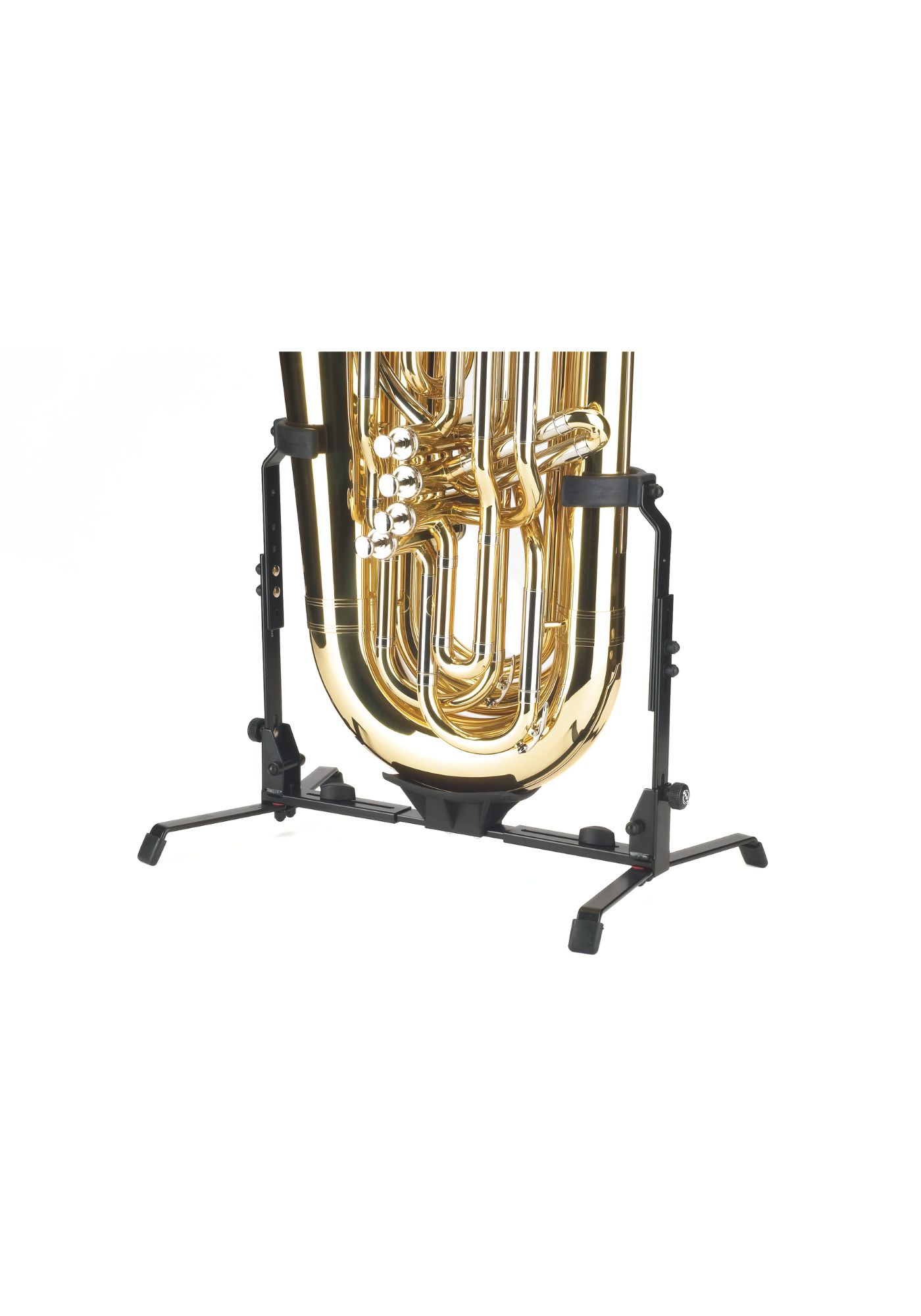 Zusammenlegbarer Ständer für deutsche und englische Tuben. Die Bügel sind vollständig mit einem Kunststoffüberzug versehen und in Höhe und Breite individuell an das jeweilige Instrument anpassbar. Das Instrument ruht auf einer federnden Kunststoff-Auflageschale, die es vor Beschädigungen schützt. Zusätzlich gibt es eine Aussparung für Instrumente mit Kamm.