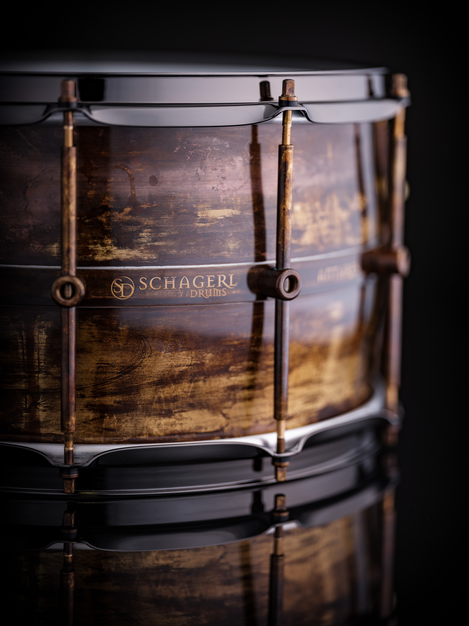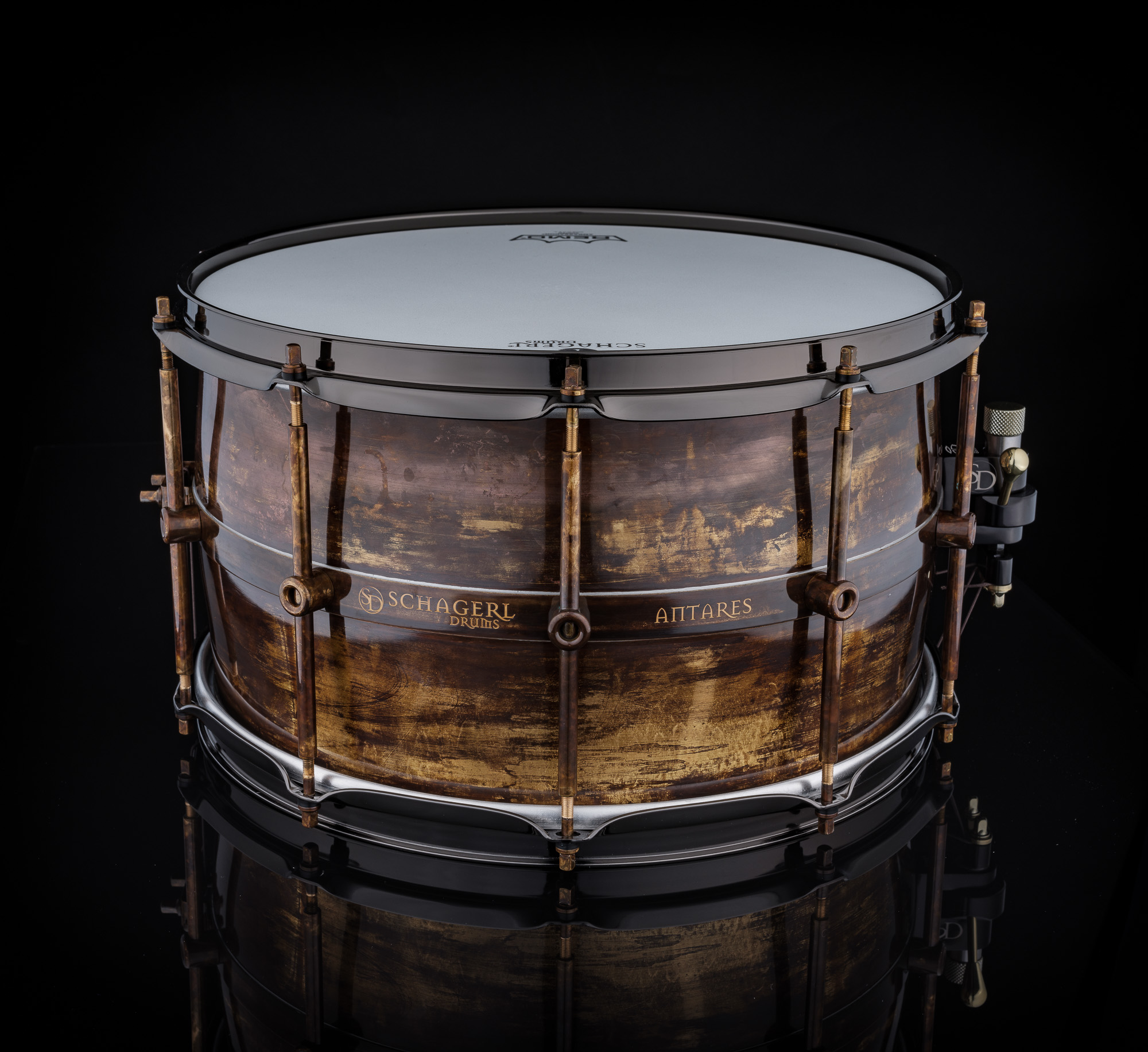 Antares ist der hellste Stern im Sternbild Skorpion und der fünfthellste sichtbare Stern am Nachthimmel. Benannt nach seiner Gleichstellung mit dem griechischen Gott Ares, ist es leicht zu erkennen, warum wir „Antares“ als Namen für diese Serie an Messing-Snaredrums gewählt haben. Jede Trommel ist ein starkes Statement, ausgestattet mit handgefertigten Messing Tube Lugs und einem 0,7 mm Messingkessel. Die 2,3 mm starken dreifach-geflanschten Stahlspannreifen, erinnern an eine kampferprobte griechische Rüstung, wobei die Trommel aber gleichzeitig eine subtile Eleganz behält. Die Schagerl-modifizierte Trick Drums Multistep Abhebung ermöglicht eine präzise Snare Teppich Einstellung, wodurch die Antares sowohl für konventionelles Schlagzeugspiel als auch für Orchesterarbeit geeignet ist. Der patentierte Schagerl Messingkessel besteht aus 5 Teilen, hat ein konvexes Design und erzeugt somit einen Pauken-ähnlichen-Effekt mit bemerkenswerter Resonanz.