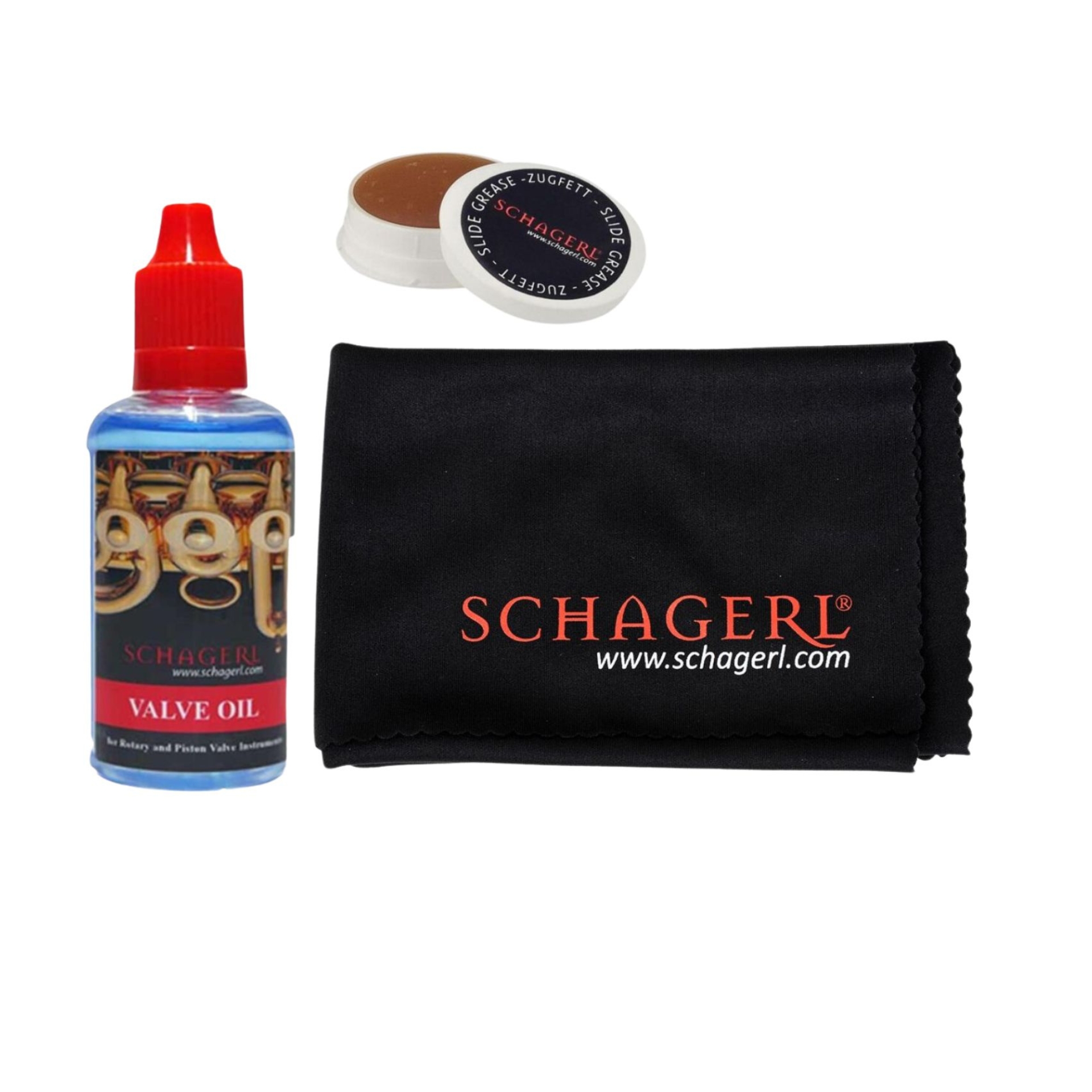 Zum Lieferumfang gehören hochwertiges Zubehör, darunter ein Schagerl Instrumentensack und Pflegeprodukte