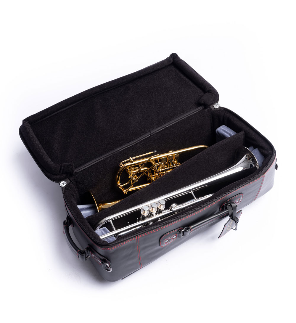 Die Griffe und Akzente aus edlem Black Nappa Rindsleder verleihen der Tasche nicht nur ein elegantes Aussehen, sondern auch angenehmen Tragekomfort. Zwei separate Außentaschen bieten ausreichend Platz für Zubehör, Noten und persönliche Gegenstände. Das seitliche Öffnen der Tasche ermöglicht ein einfaches und schnelles Verstauen der Instrumente.Model für zwei Trompete (Perinet - oder Drehventil) Ausführung Hybrid Bag mit eingelegter Polymerverstärkung Material in Handarbeit aus 1680D Gewebematerial hergestellt Besonderheit Griffe und Akzente aus bestem Black Nappa Rindsleder Ausstattung 2 separate Außentaschen, Rucksackgurte fix montiert Maße 59 x 24 x 23 cm Gewicht 3,45 kg