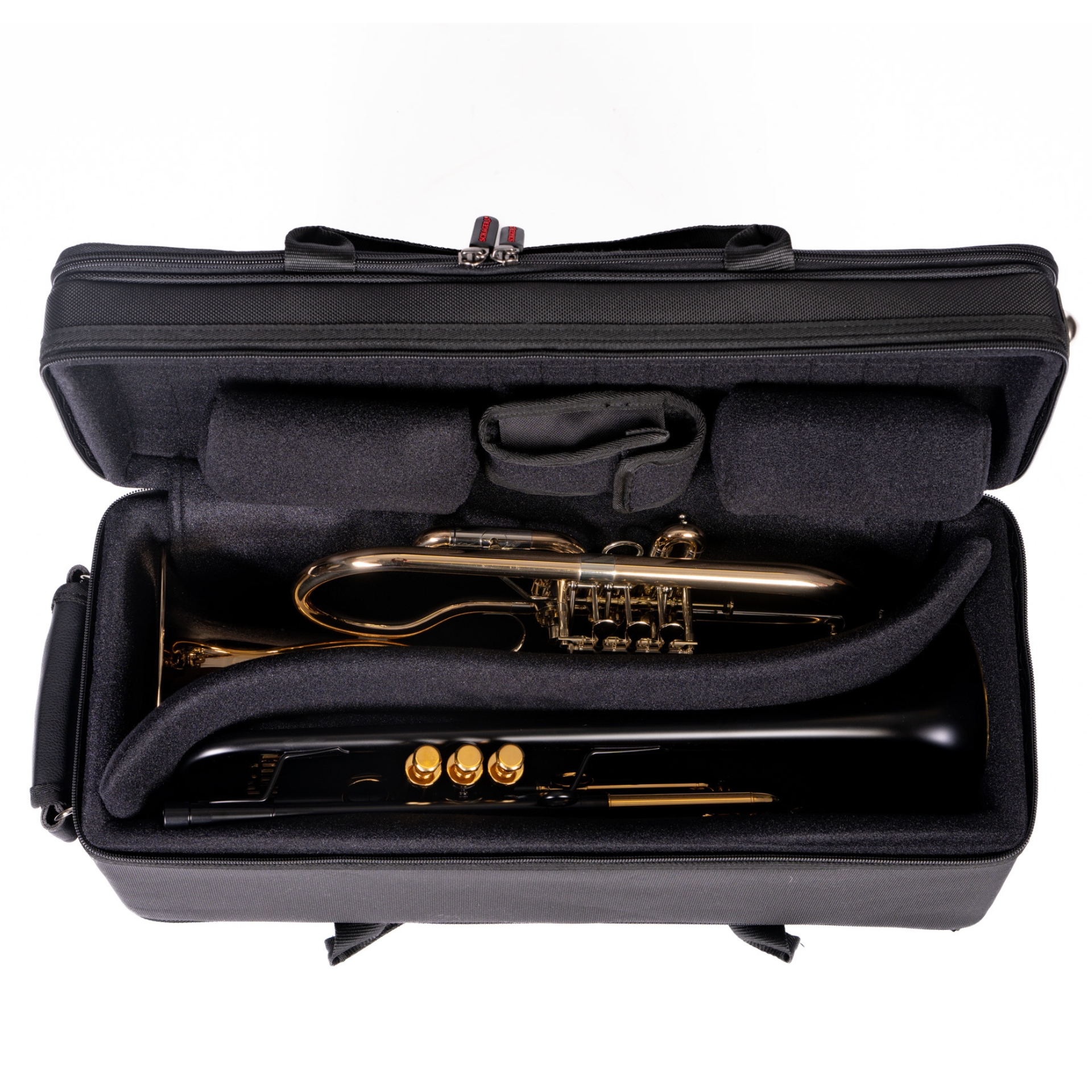 Das Schagerl Meister Doppel-Etui für Trompete vereint Funktionalität, Schutz und elegantes Design in einem hochwertigen Koffer. Aus strapazierfähigem Cordura gefertigt, bietet es eine langlebige und pflegeleichte Oberfläche, die den Anforderungen des Musikeralltags gerecht wird.