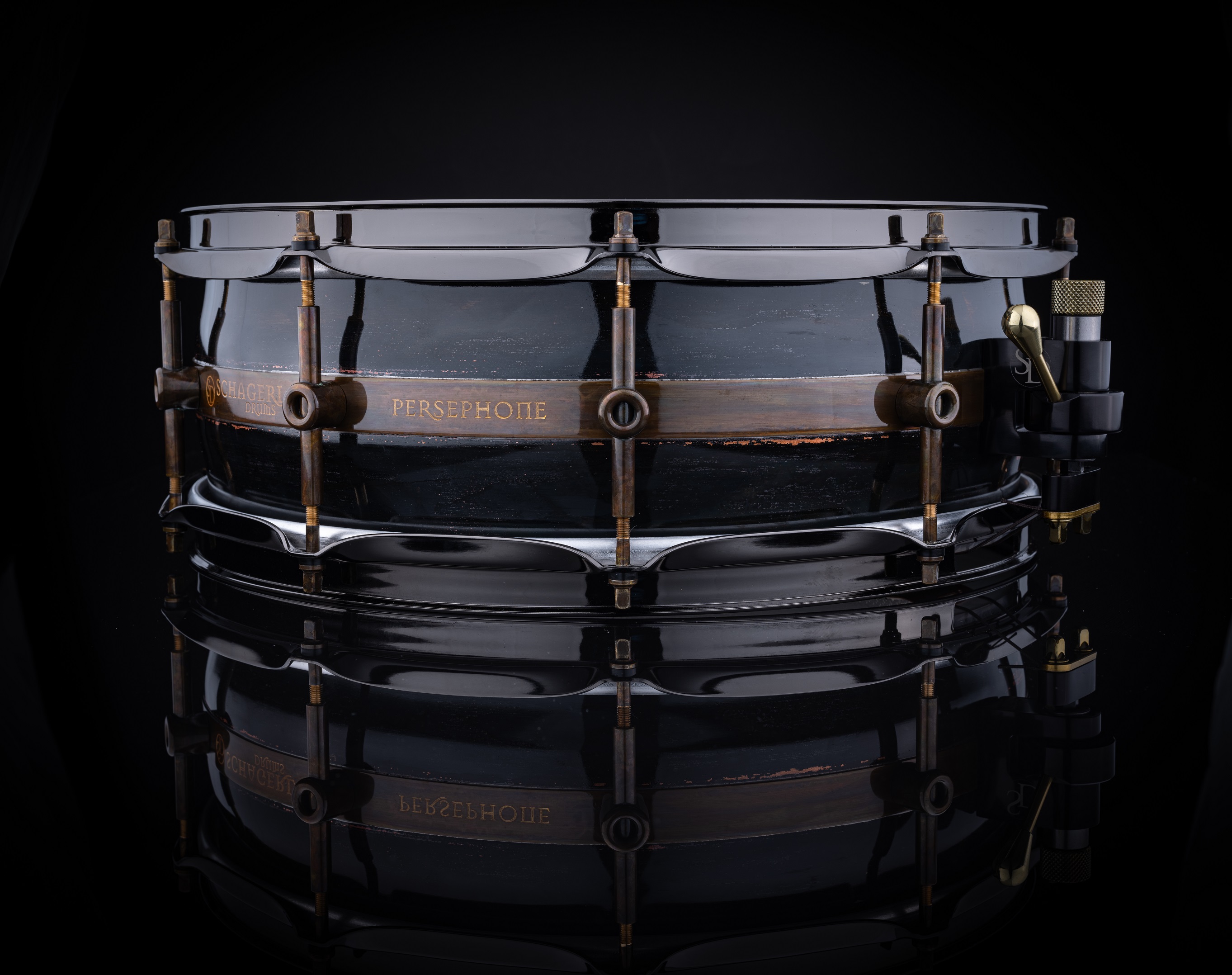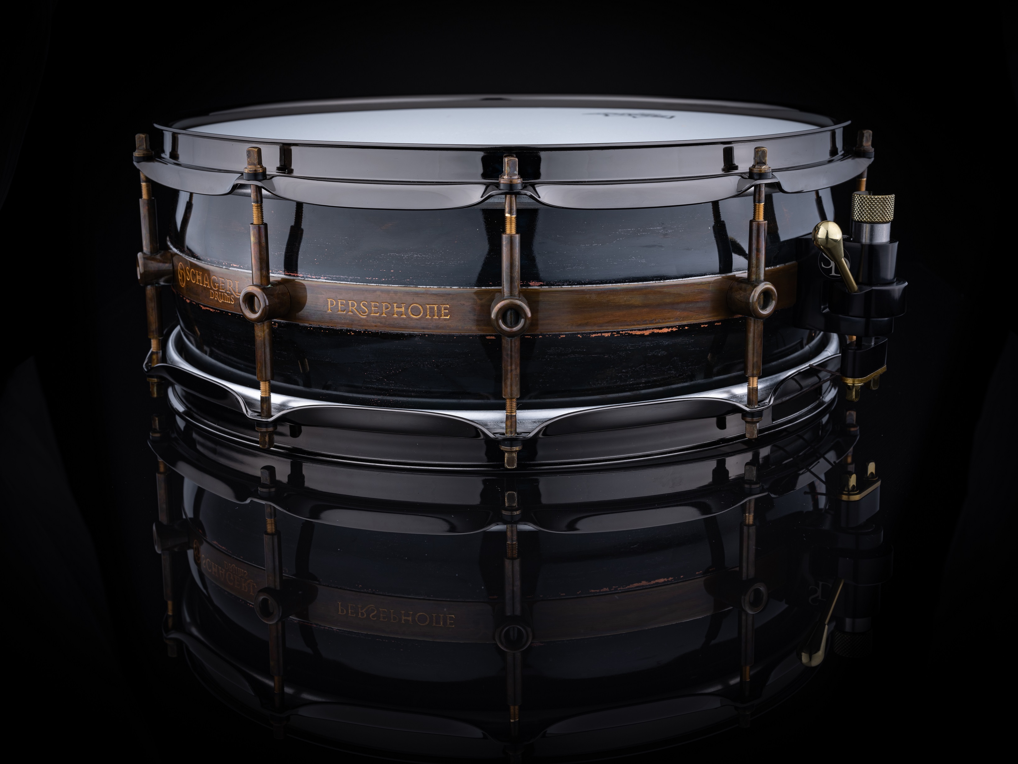Persephone ist der griechischen Namensgeberin in jeder Hinsicht würdig. Der patentierte Schagerl Kupfer-Trommelkessel besteht aus 5 Teilen, hat ein konvexes Design und erzeugt somit einen Pauken-ähnlichen-Effekt mit bemerkenswerter Resonanz, während der Sound leicht kontrollierbar bleibt. Die Schagerl-modifizierte Trick Drums Multistep Abhebung ermöglicht eine präzise Snare Teppich Einstellung. Die akustisch neutrale Natur der Trommel macht sie zu einer idealen Studiotrommel.
