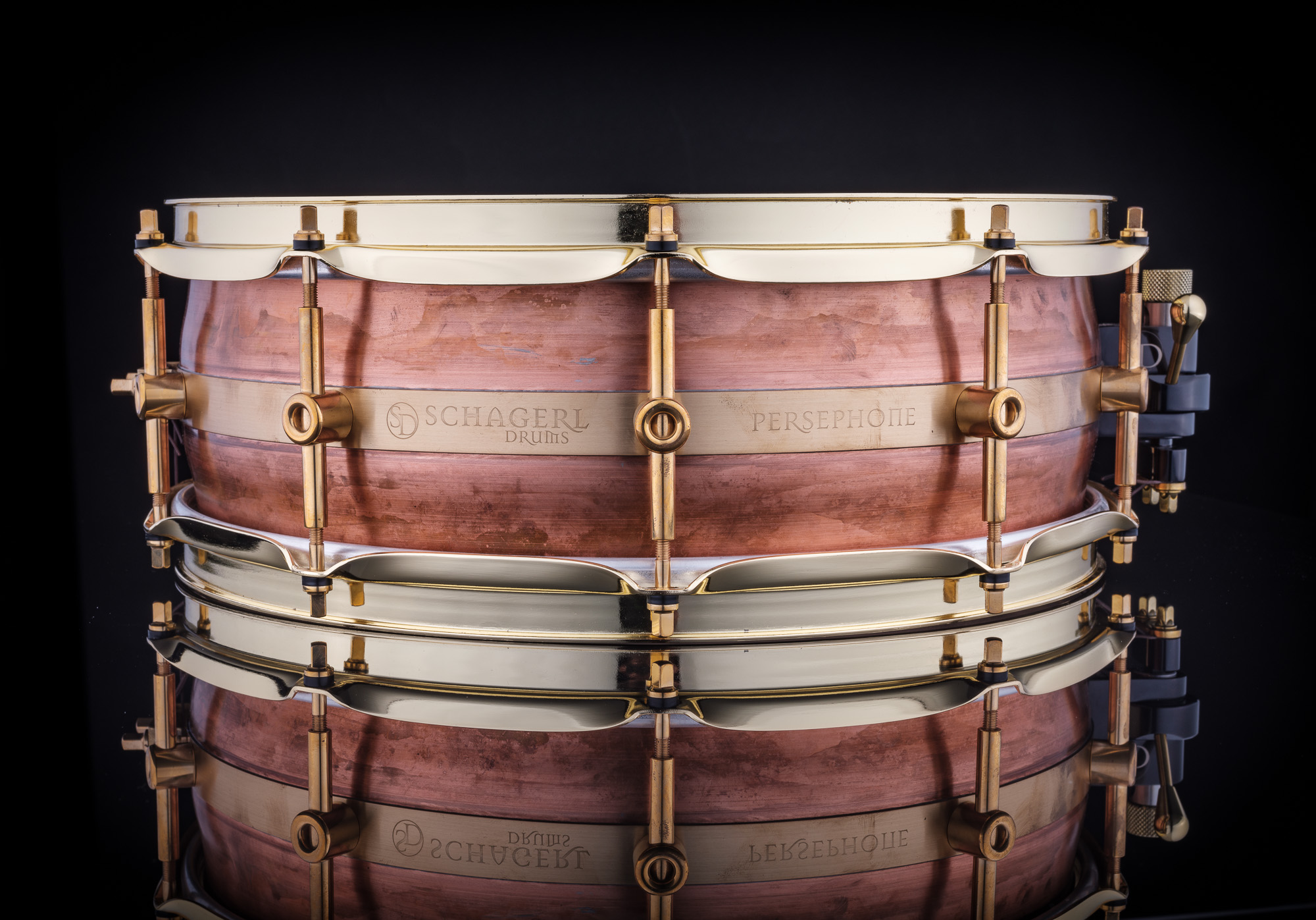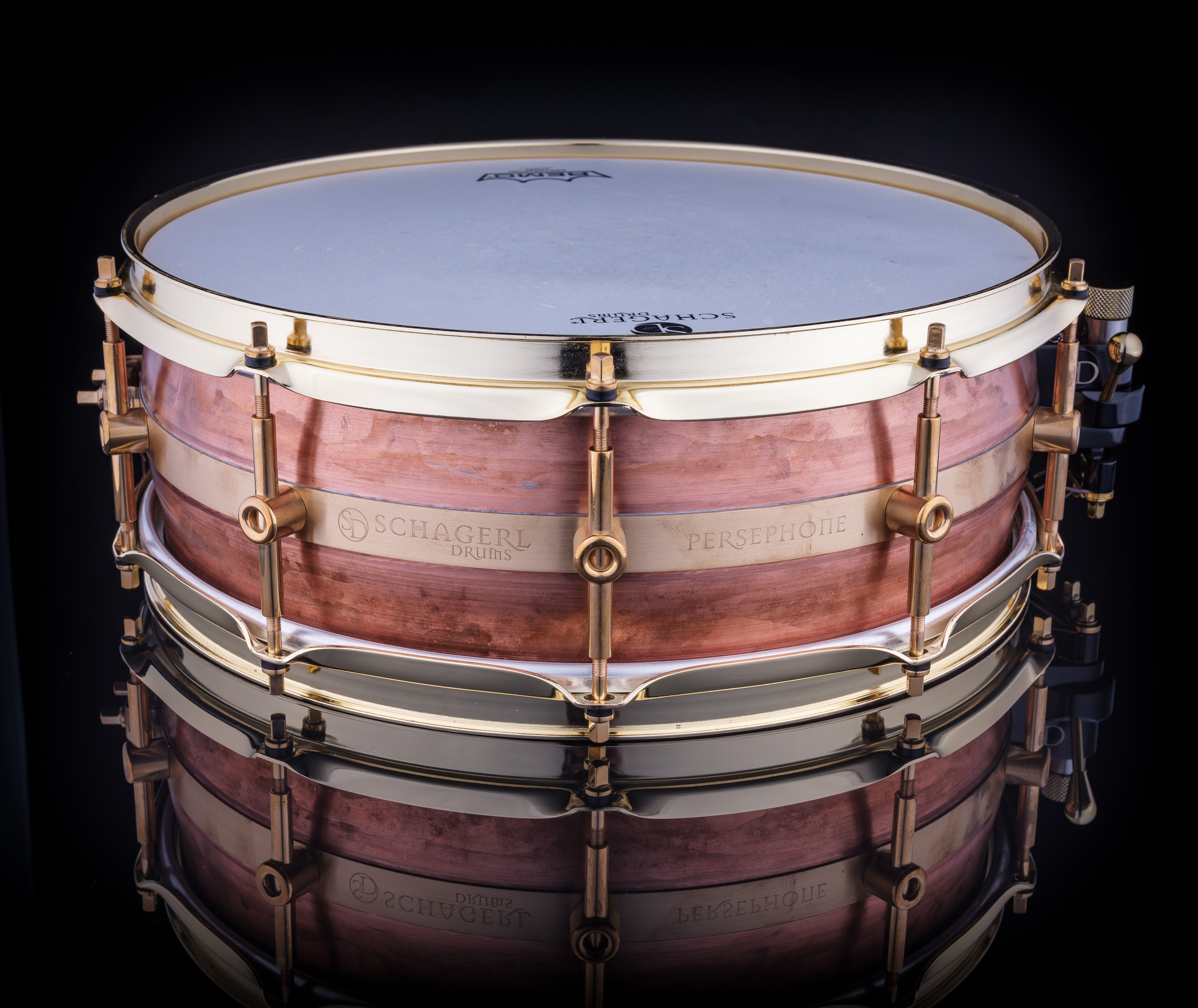 Persephone ist der griechischen Namensgeberin in jeder Hinsicht würdig. Der patentierte Schagerl Kupfer-Trommelkessel besteht aus 5 Teilen, hat ein konvexes Design und erzeugt somit einen Pauken-ähnlichen-Effekt mit bemerkenswerter Resonanz, während der Sound leicht kontrollierbar bleibt. Die Schagerl-modifizierte Trick Drums Multistep Abhebung ermöglicht eine präzise Snare Teppich Einstellung. Die akustisch neutrale Natur der Trommel macht sie zu einer idealen Studiotrommel.